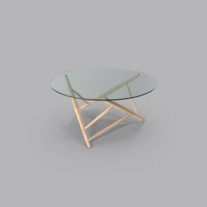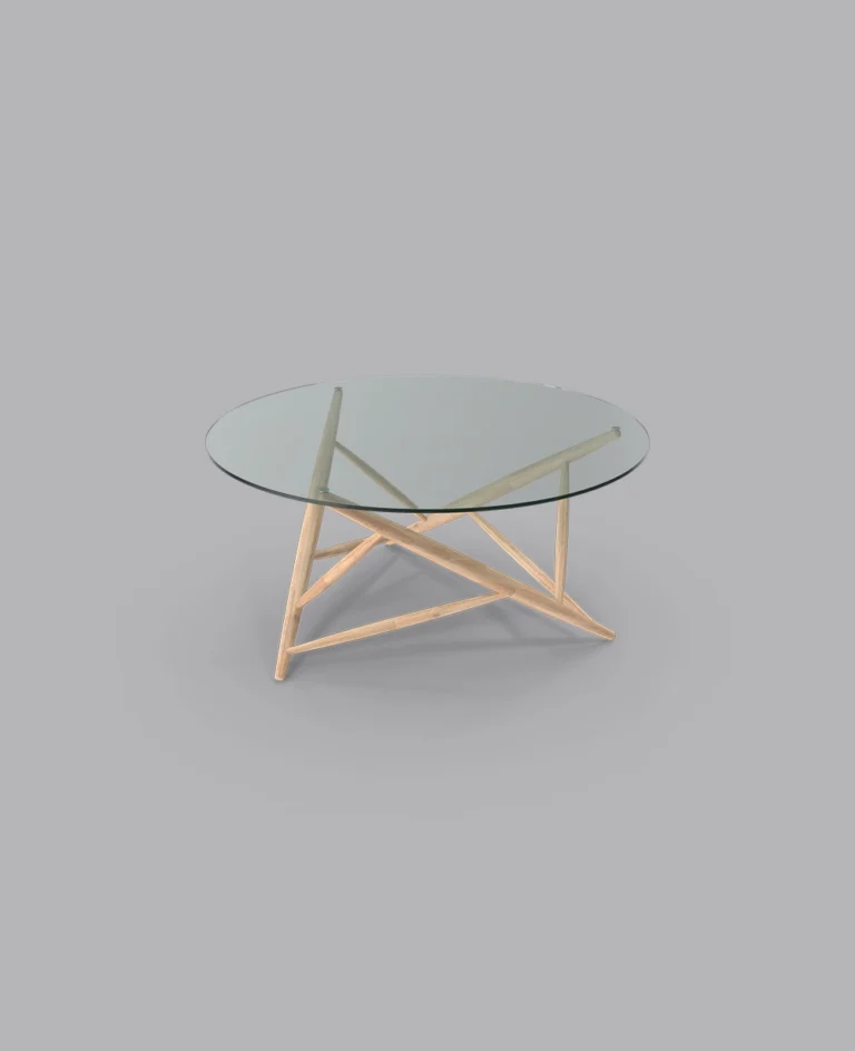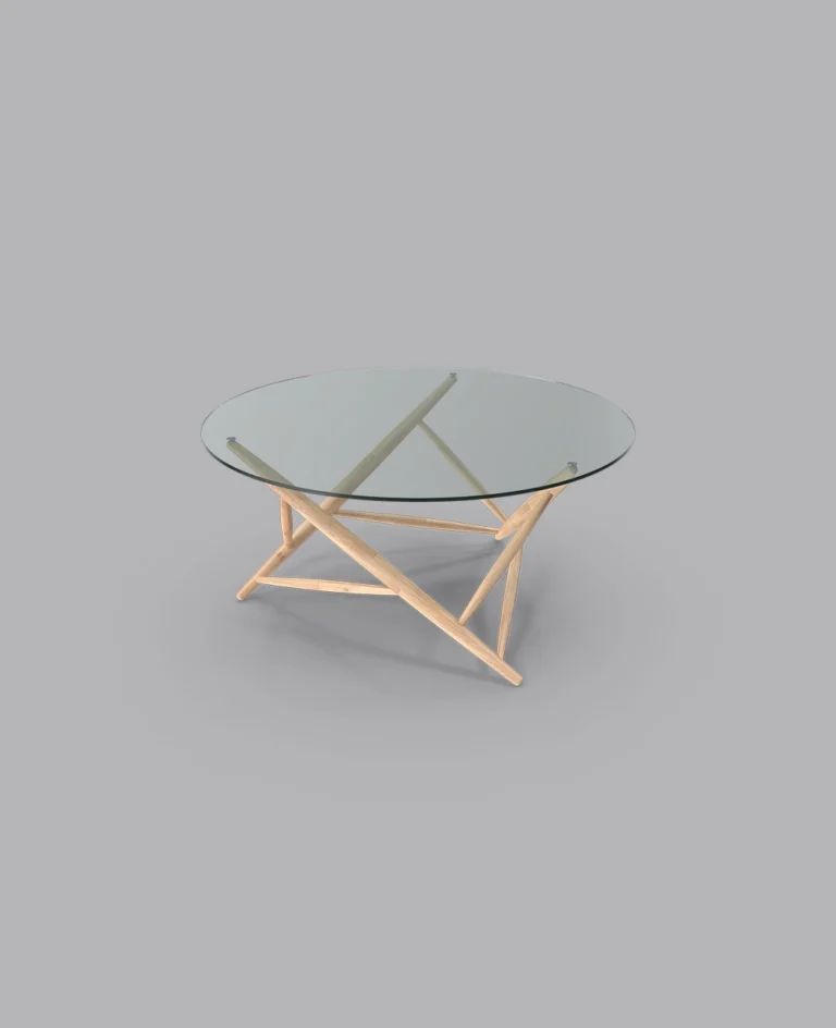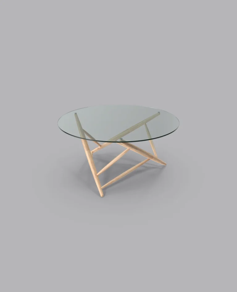 The Axis Table combines a sleek glass top with a unique geometric wooden base, bringing modern style and structural elegance to any space.